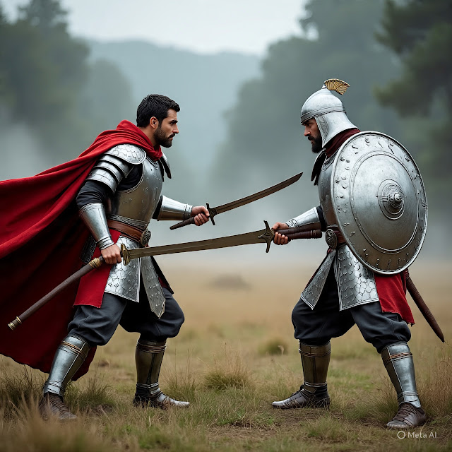 যুদ্ধৰ পূৰ্ব মুহূৰ্তত পৰস্পৰে পৰস্পৰৰ ফালে উদ্ধত ভংগীত চাই নিজক মানসিক ভাবে প্রস্তুত কৰি ল’লে। তাৰ পাছত উভয় বীৰ সিংহ বিক্ৰমত ইজনে সিজনৰ ফালে চোঁচা ল’লে।